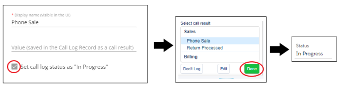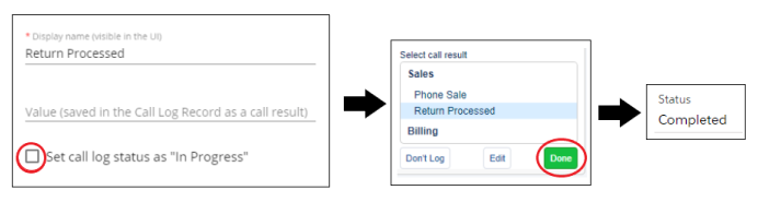- A call log submitted with the call result prompts the CRM to save the call log task in an "In Progress" / "Open" state.