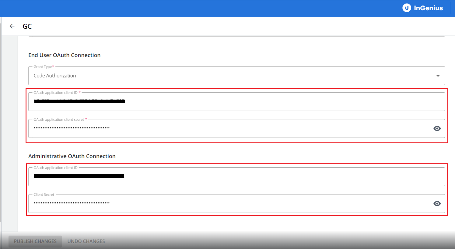 Under Administrative OAuth Connection, fill in the 'OAuth application client ID' and 'Client Secret' fields with the Client ID and Client Secret of the second Genesys OAuth Client you created in the previous section, the one with Grant Type - Client Credentials.