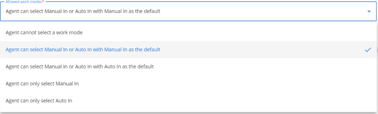 An InGenius administrator can set which work mode selections are available to agents. One of five options are available: