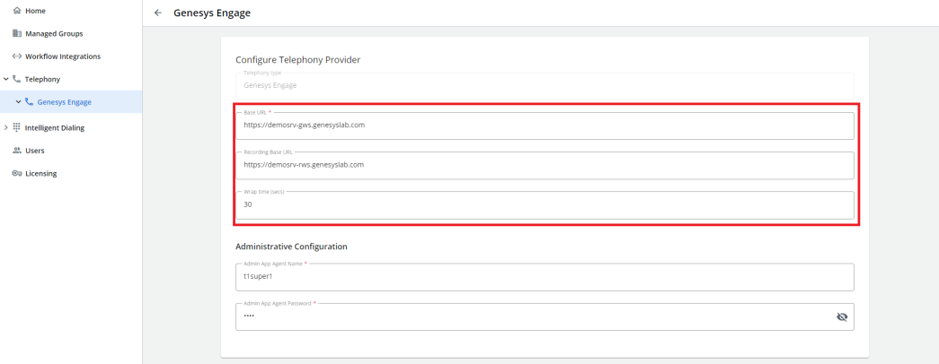 Under 'Configure Telephony Provider', fill in the Base URL and Recording Base URL fields for your Genesys server.