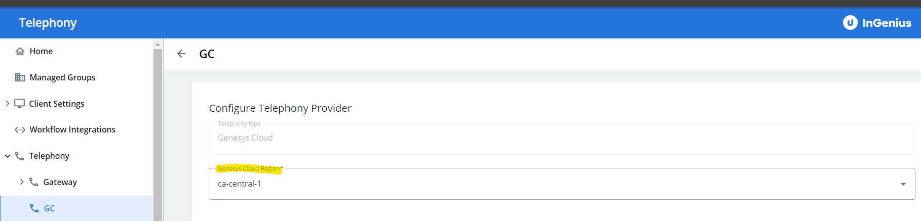 In the Admin App, select the Telephony tab, and then select the telephony provider profile created for Genesys