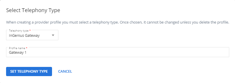 - Select the Telephony type dropdown > InGenius Gateway.