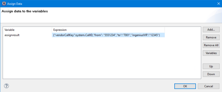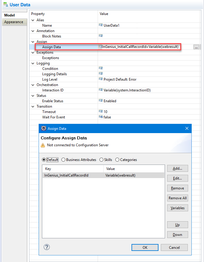 Used in the routing application to update user data, used in this example to take the web result variable and set an InGenius id for the user. The Assign Data field has a key called 'InGenius_InitialCallRecordId' set to the 'webresult' variable.