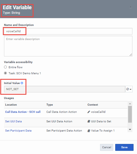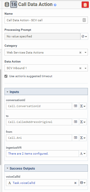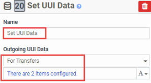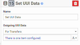 Set UUI participant data action - configured with the UUI variables:(Expression type)"Task.accountnumber", (Expression type) "Task.voiceCallId"