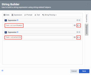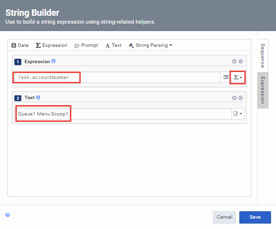 Configured with the UUI variables: (Expression type) "Task.accountnumber", (Text type) "Queue1 Data1 Data2"