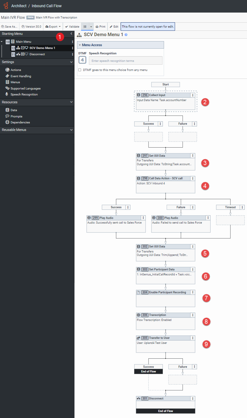 To help with the implementation of your IVR, an example Genesys IVR flow with the required configuration is described below: