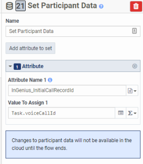 Setup participant data action - attribute (Literal string type) "InGenius_InternalCallRedoid", set with value (Expression type) "Task.voiceCallId"