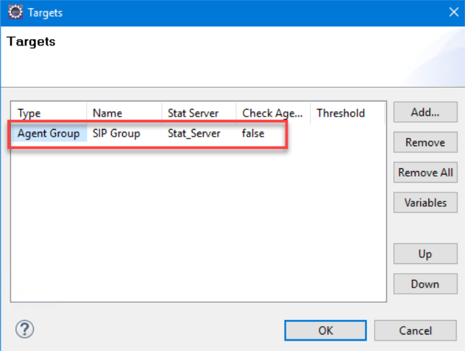 Used to route a voice interaction to a target. In the example here, the Targets field is configured to assign an SIP group as the target. Note: Make sure your agent is part of the SIP group that you will be using, and be sure to select the Stat_Server. |