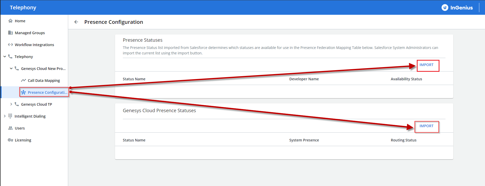 3. In the Presence Configuration page, select Import from under both the Presence Statuses table, and the Genesys CloudGenesys Engage Presence Statuses table.