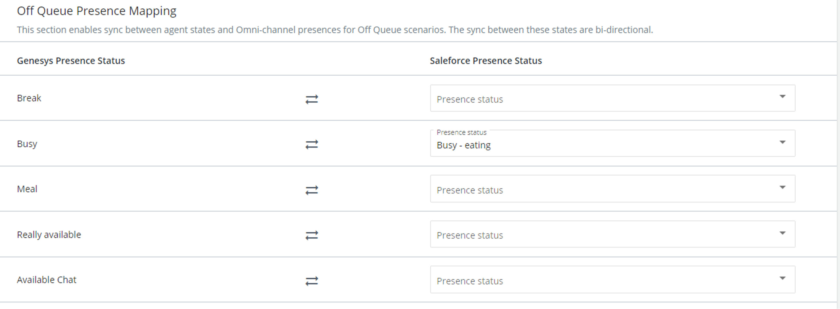 • Ensure you have created an equivalent presence status in Salesforce for each Genesys CloudGenesys Engage status available to agents.