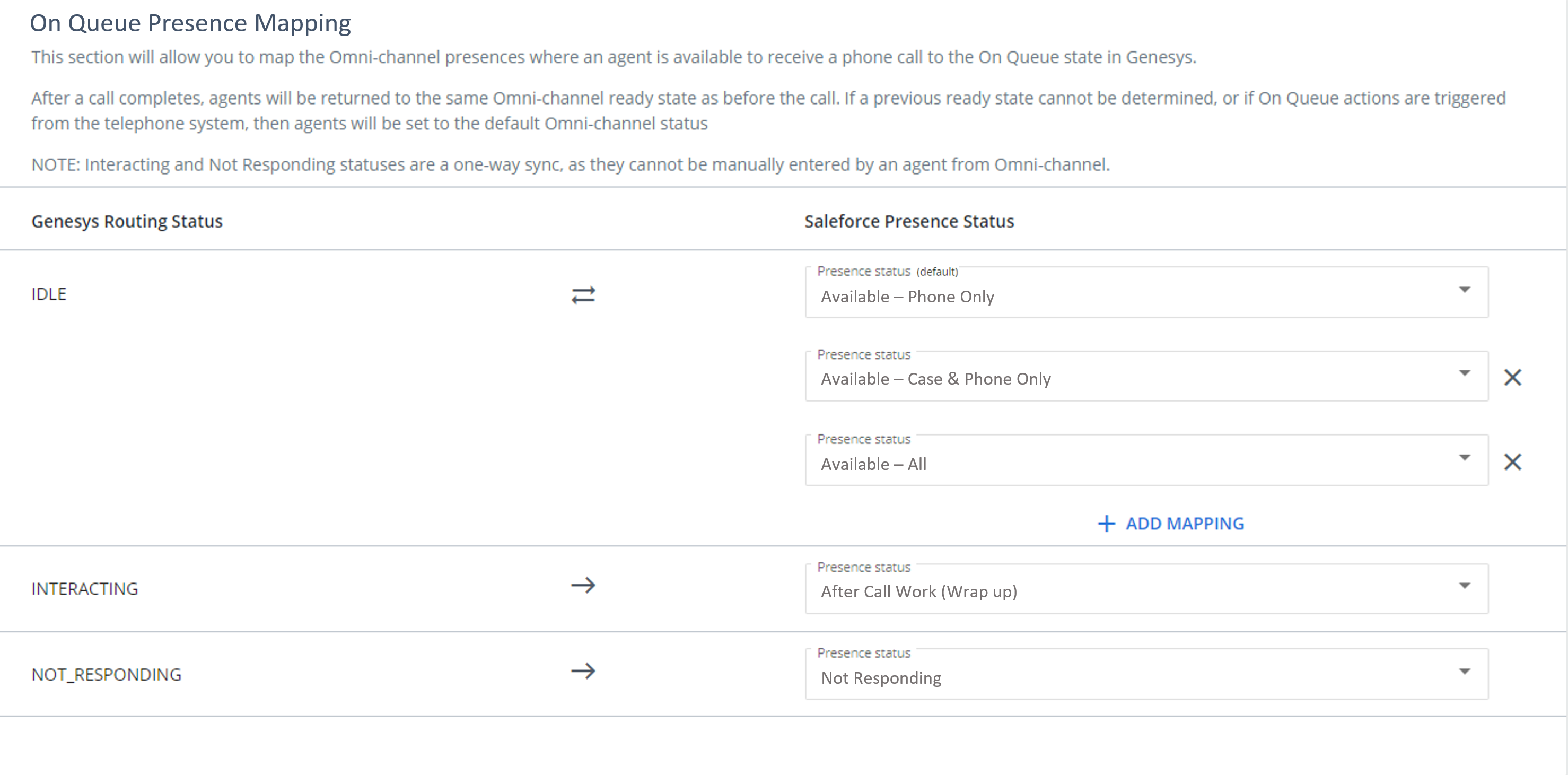 • You must map the 'IDLE' Genesys routing status to at least one 'Available' Salesforce presence status. Multiple mappings are supported for this status and can be added by pressing '+ ADD MAPPING' .