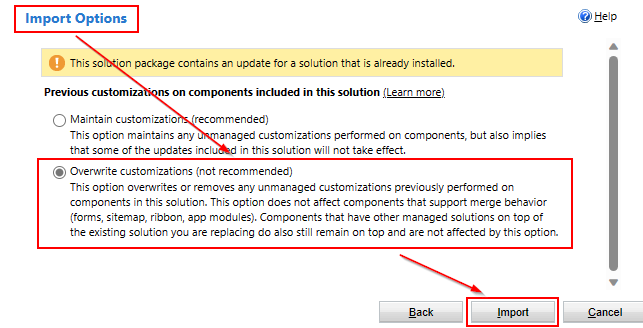 Note: If you are overwriting an existing solution file, select the 'Overwrite customizations (not recommended)' option when prompted and click Import.