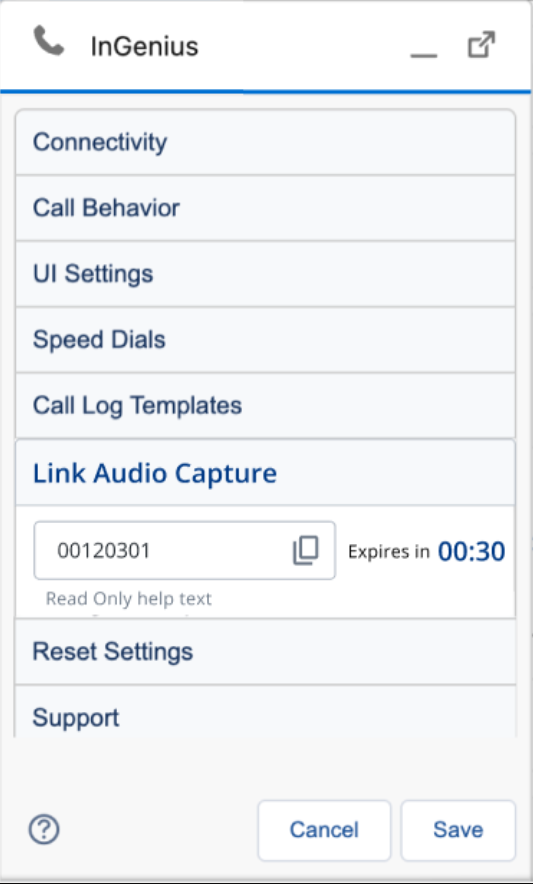 | 2. Enter Link Code | Used to link the Audio Capture app with InGenius. This link code can be obtained from the InGenius call UI. |