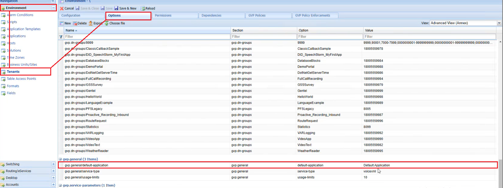 Under the Options tab, scroll down to find the "gvp.service-parameters" section.