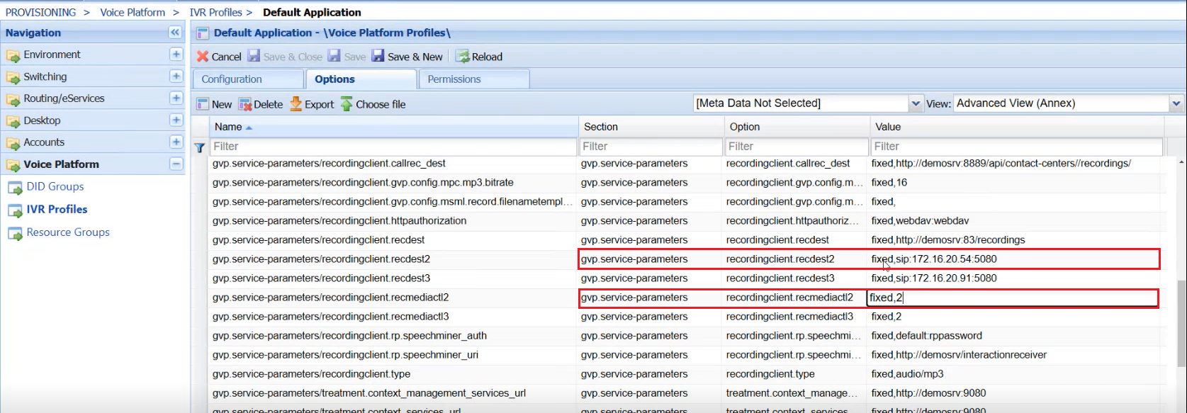 Find and select an unassigned "recordingclient.recdest" option and modify the Value column as follows: