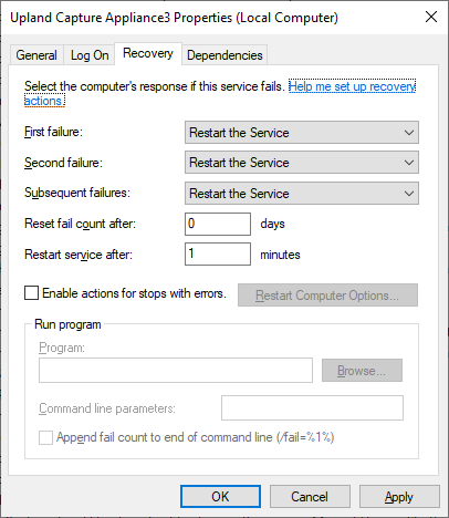 Under the Recovery tab, configure the service to restart 1 minute after failure, then press OK.