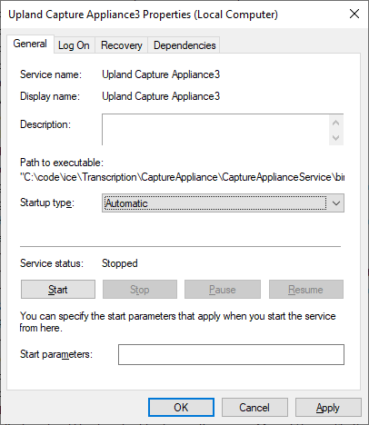 Right-click on the service named 'Upland Capture Appliance' to open its properties window