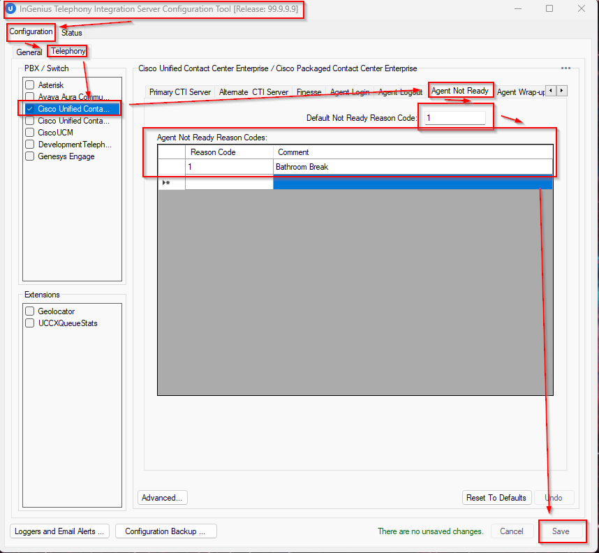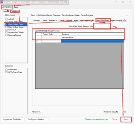 - For the Default Not Ready Reason Code textbox, input a value of 1.