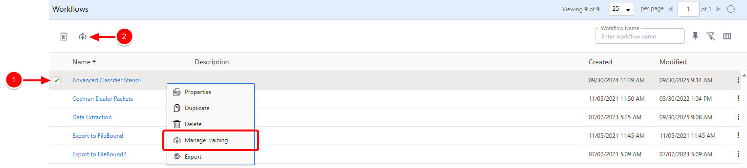 Right-click anywhere in the workflow row or click the three dots next to the workflow you want to access training for, then select Manage Training from the drop-down menu.