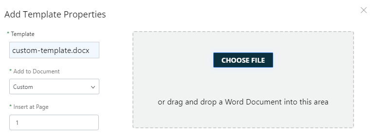 - Click Choose File and navigate to the .docx, .doc, or .rtf file you want to use, then click Open. Or, move the Microsoft Word document to the Add Template properties window using a drag-and-drop operation.