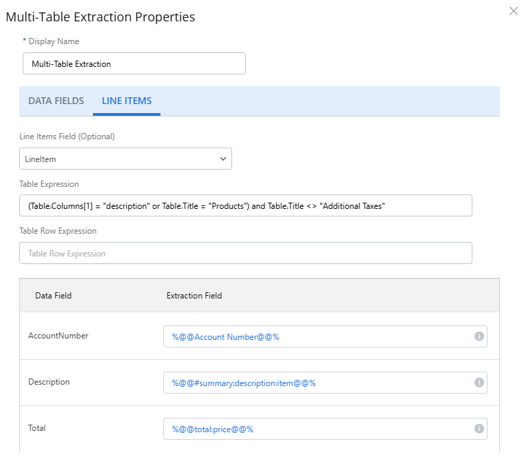 Property Example Table.Title Table.Title = “Billing” Table.Index Table.Index = 1 (1 based) Table.Location.Page Table.Location.Page = 1 (1 based) Table.Location.Top Table.Location.Top > 350 Table.Location.Bottom Table.Location.Bottom < 600 Table.Location.Left Table.Location.Left < 20 Table.Location.Right Table.Location.Right = 500 Table.Location.Width Table.Location.Width > 500 Table.Location.Height Table.Location.Height < 200 Table.Columns.Count Table.Columns.Count = 2 Table.Columns[index number] as a string Table.Columns[0] = “quantity” Index is zero based. Use lowercase. Table Row Expression: An expression that allows you to specify which table rows to extract data from. When this field is left empty, data from all table rows will be extracted.