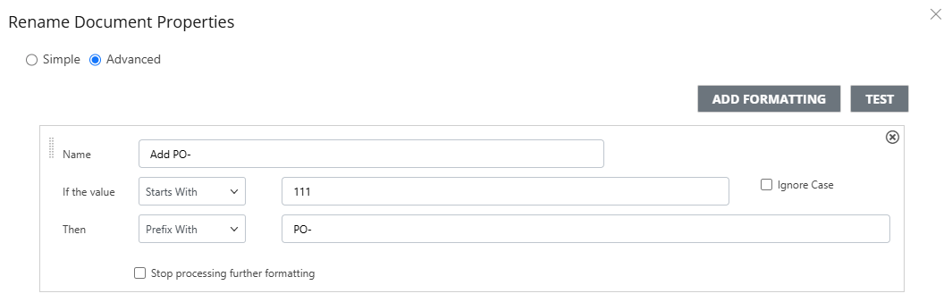 - Advanced: Allows you to specify formatting rules for the document name. See Add formatting to a document name below.