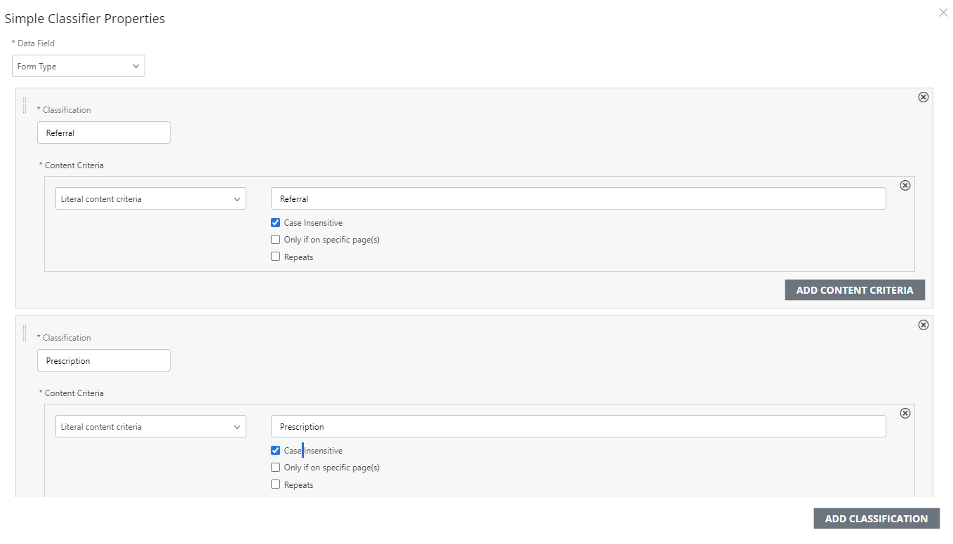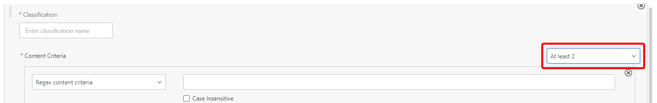 Click Add Content Criteria to add additional content criteria to the classification if necessary. If you have multiple content criteria, a drop-down list will appear on the upper right. Select how many content criteria must be true for this classification to match.