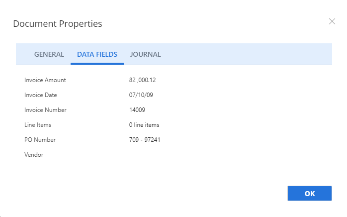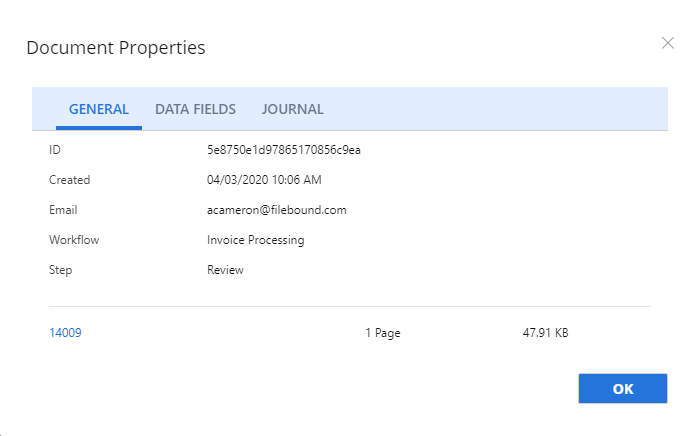 The General tab lists general information related to the document, such as the document ID and current workflow step.