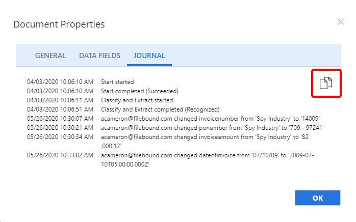 The Journal tab displays a list of all activity related to the document. If there is an error or problem with a workflow, this data can be copied and sent to support for troubleshooting.