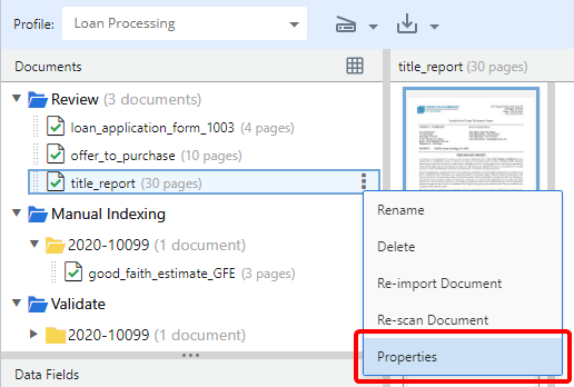 In the Document Panel, right-click the document you want to view properties for, then select Properties from the drop-down menu. Or, click the three dots next to the document you want to view properties for, then select Properties from the drop-down menu.