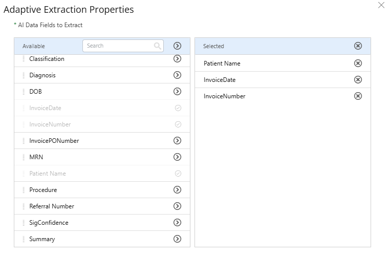 Click Add (>) next to the data field(s) you want to extract from the document. Or, move data fields from the Available box to the Selected box using a drag-and-drop operation.