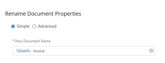 Simple: Enter a new name for the document in the New Document Name box. This field supports data field substitution.