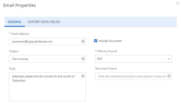 Email Address: The email address documents will be sent to. This field supports data field substitution.