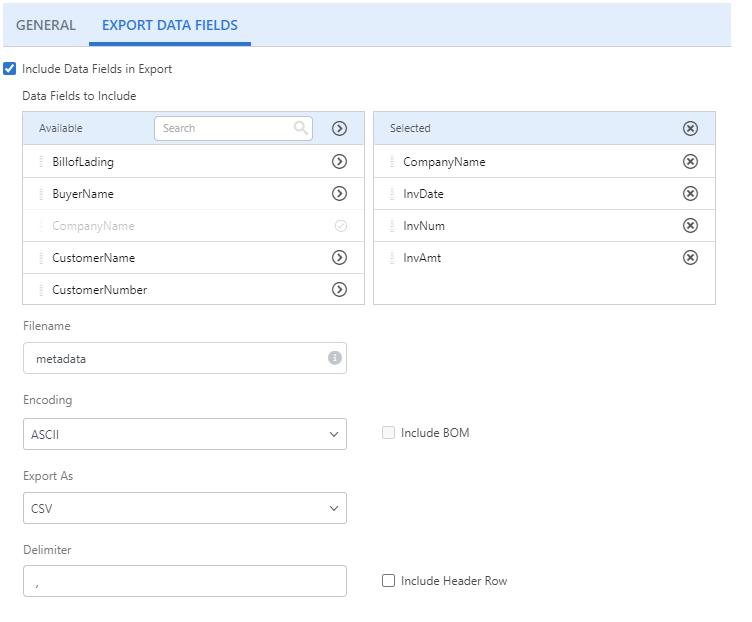 Include Data Fields in Export: Select this check box to export data fields associated with the document.