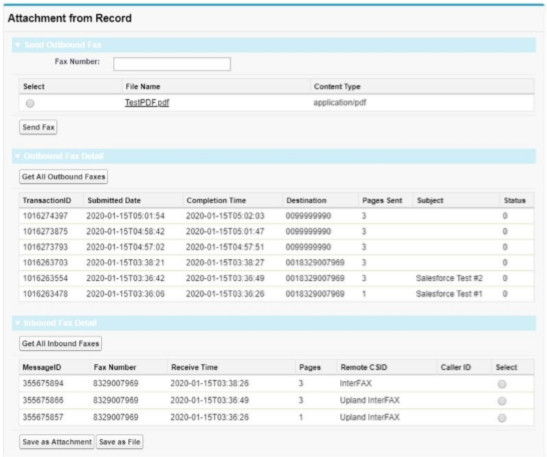 Upland InterFAX’s Salesforce Classic Faxing API allows organizations to embed faxing capabilities into their Salesforce experience, enabling the ability to both send and receive fax communications from within the Salesforce interface.