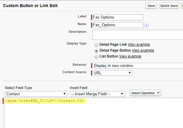 Paying attention to the highlighted section, create your button by using the name of the page you created earlier (e.g. “InterFAX_UI” as created in Step 9.) and save.
