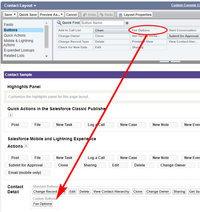 Under Contact Layout, select Buttons from the left-hand side, and then drag-and-drop the Button (e.g. Fax Options), created in step 12, to the appropriate section (as seen below), and save.