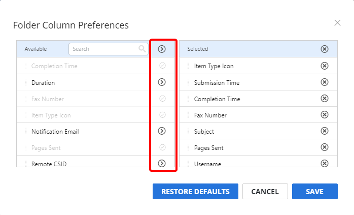 Click Add (>) next to the column(s) you want to view on the page. Or, move columns from the Available box to the Selected box using a drag-and-drop operation.