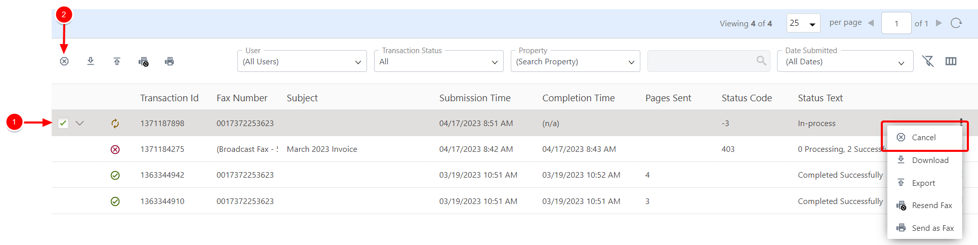 Right-click anywhere in the fax row or click the three dots next to the fax you want to cancel, then select Cancel from the drop-down menu.