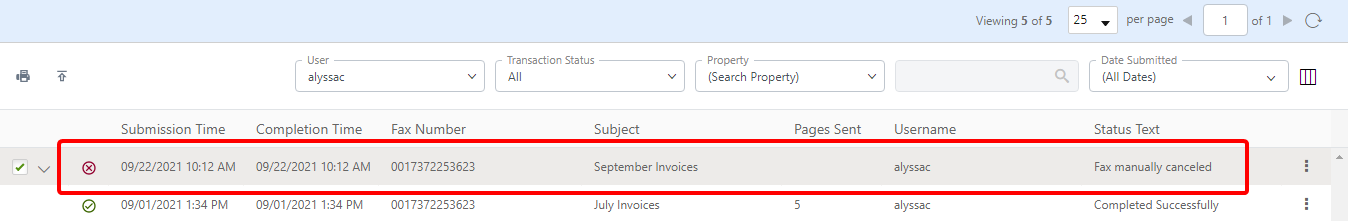 A red X will appear next to the fax row, and the fax status will change to Fax manually canceled.
