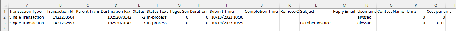 You can export CSV or XML file that contains information for all of your outbound faxes, or for specific faxes. The following information is included in a CSV or XML export.