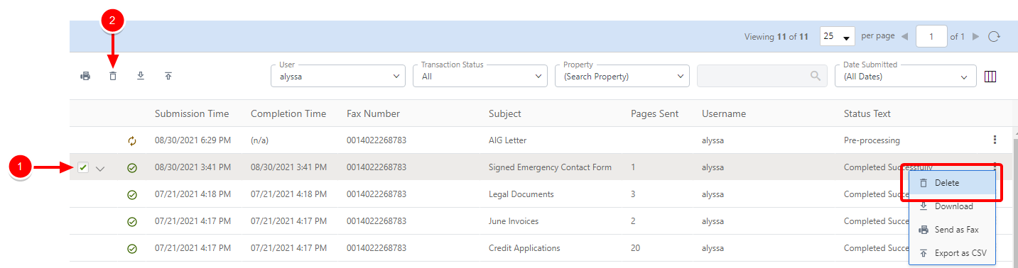 Or, select the check box next to one or multiple faxes, then click Delete.