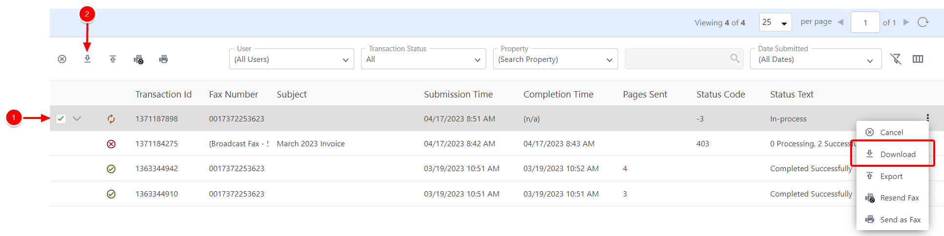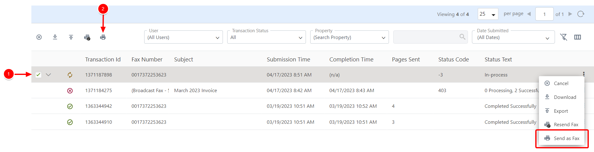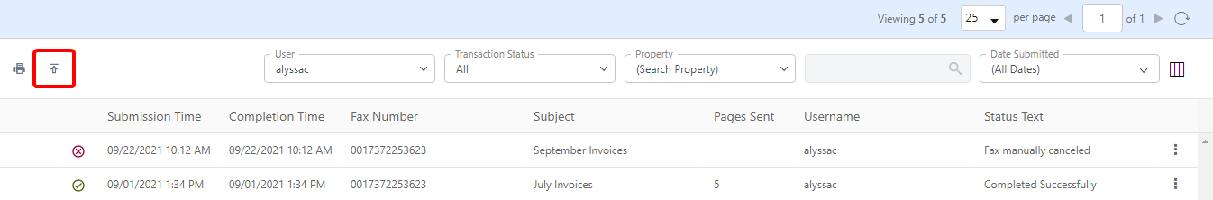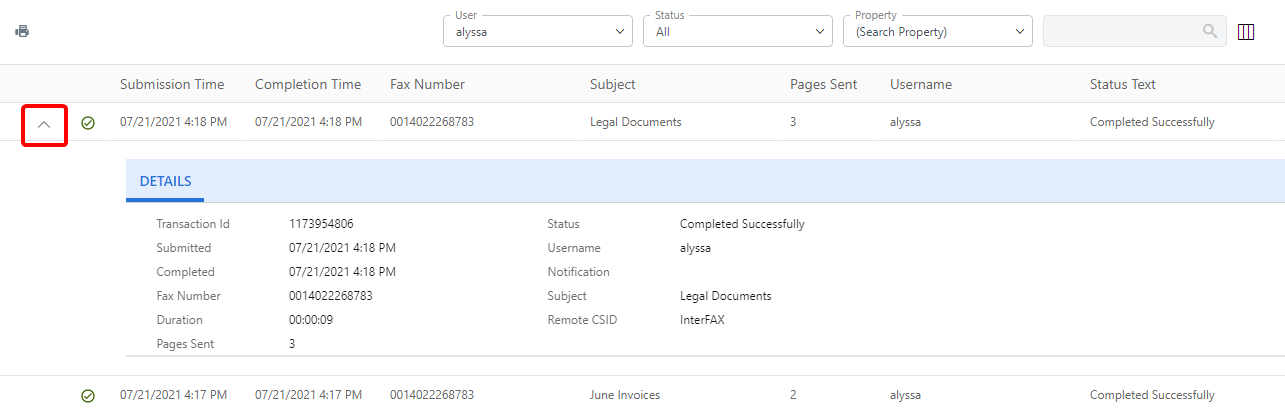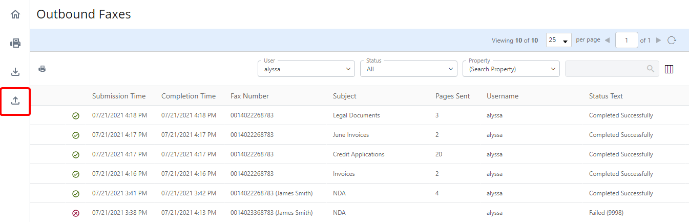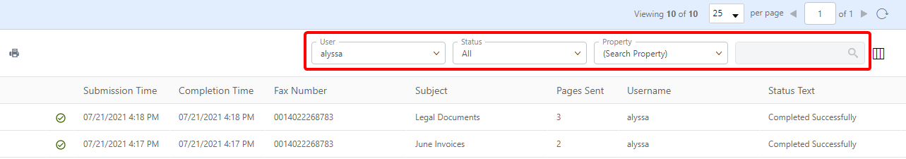 Outbound faxes can be filtered by user, transaction status, property, or date submitted.
