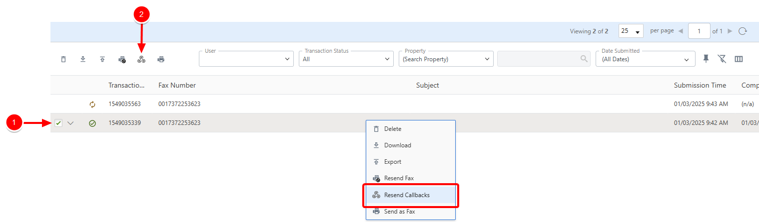 Right-click anywhere in the fax row or click the three dots next to the fax you want to resend callbacks for, then select Resend Callbacks from the drop-down menu.