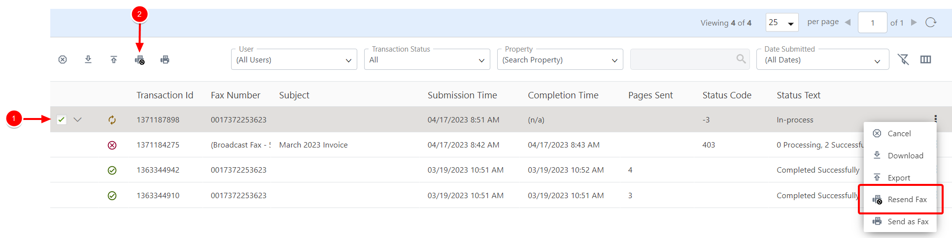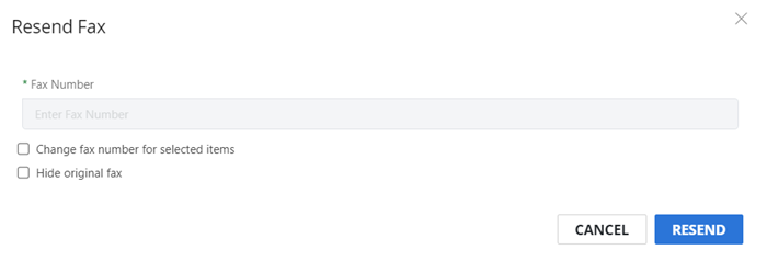Or, select the check box next to one or multiple faxes, then click Resend Fax.