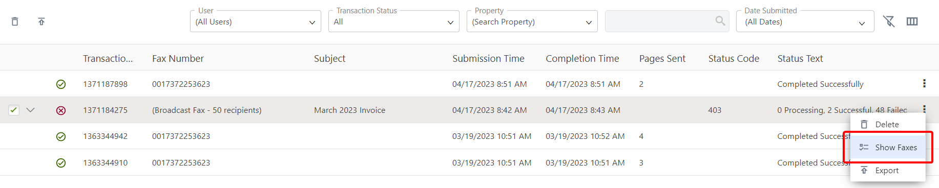 Right-click anywhere in the fax row or click the three dots next to the broadcast fax, then select Show Faxes from the drop-down menu.