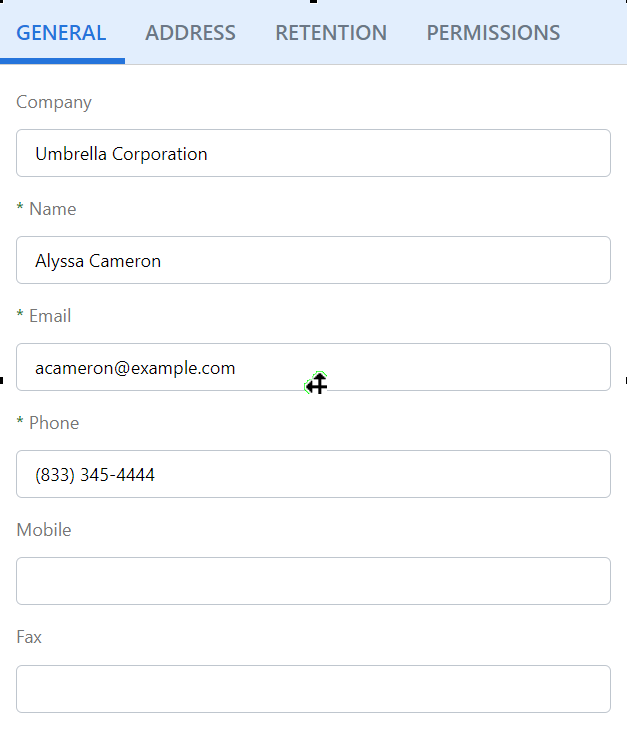 General account information, such as your company name and your name and email address, is stored on the General tab.