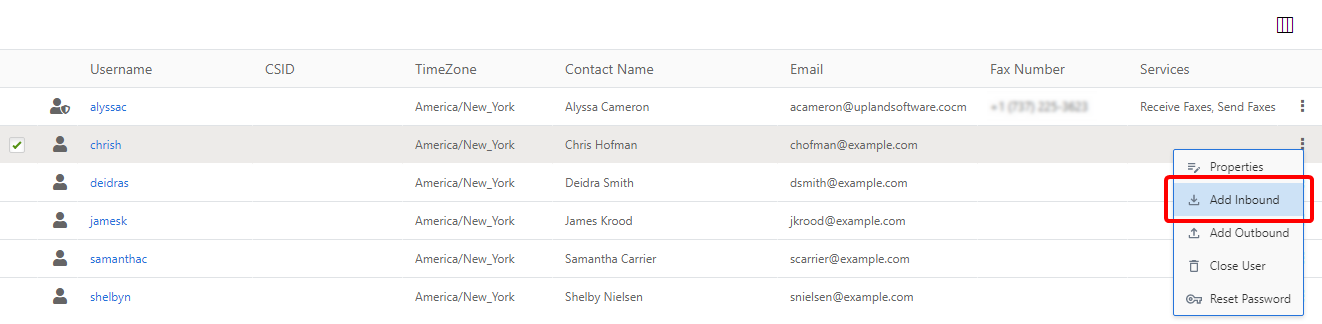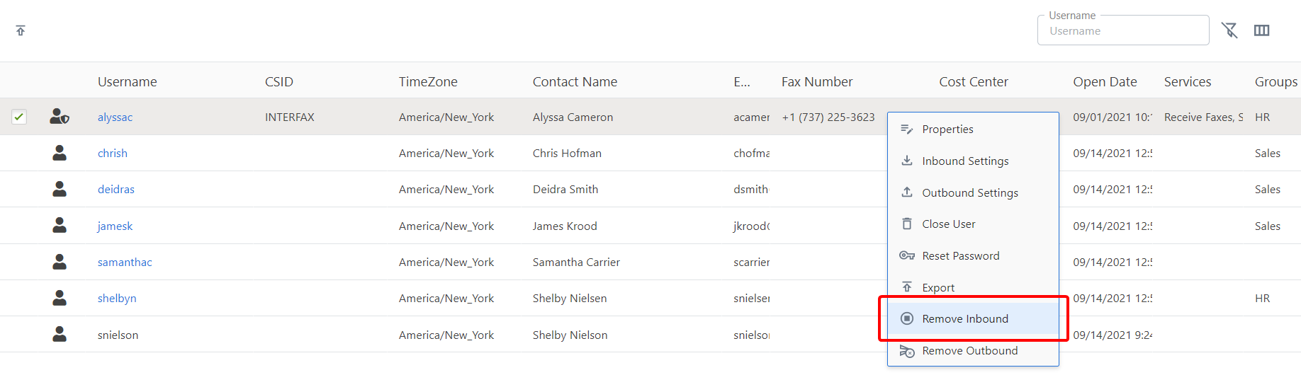 1. Right-click anywhere in the user row or click the three dots next to the user you want to remove inbound service from, then select Remove Inbound from the drop-down menu.
