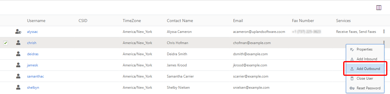 1. Right-click anywhere in the user row or click the three dots next to the user you want to add outbound service for, then select Add Outbound from the drop-down menu.