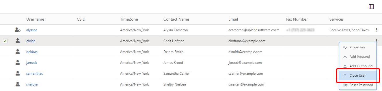 1. Right-click anywhere in the user row or click the three dots next to the user you want to close, then select Close User from the drop-down menu.